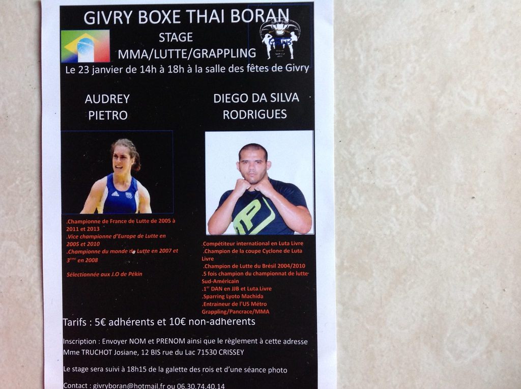 Audrey Prieto , championne du monde 2007 et Diego Da Silva Rodriguez ,5 fois champion du championnat de lutte Sud-américain seront présents samedi 23 janvier 2016 à la salle des fêtes de Givry pour un stage exceptionnel.